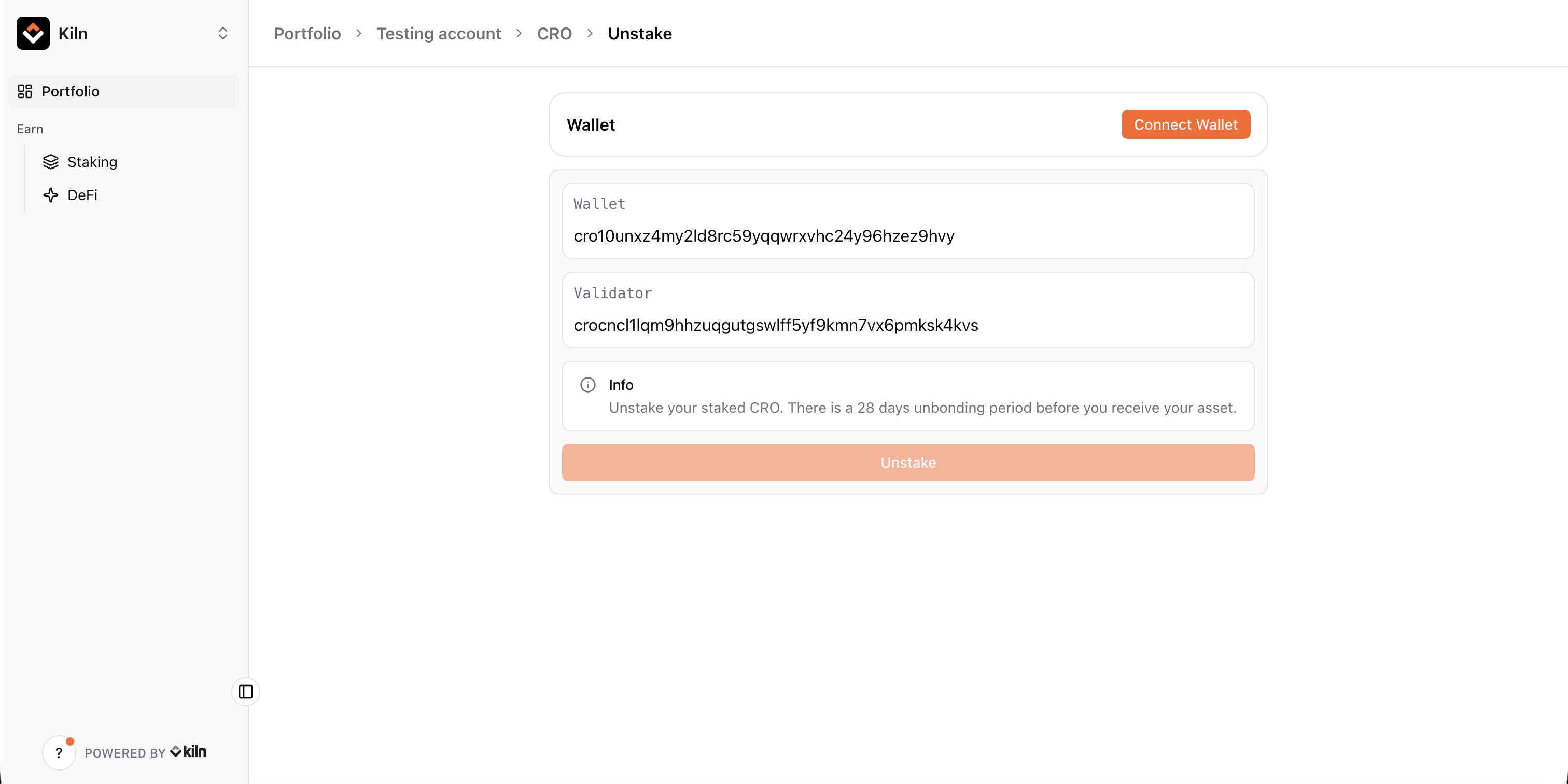 Please keep in mind that the unstaked CRO becomes unbonding and you will need to wait for 28 days before you can use those CRO again.
